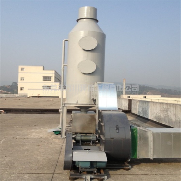 含塵廢氣在風(fēng)機(jī)的作用下,含塵氣體從塔體下方進(jìn)氣口沿切向進(jìn)入濕式除塵器噴淋塔,在風(fēng)機(jī)的作用下,迅速充滿進(jìn)氣段空間,然后塔頂位置的噴淋頭向下噴水,水與含塵廢氣接觸,使得空氣和粉塵分離,達(dá)到除塵的效果。濕式除塵器噴淋塔具有結(jié)構(gòu)簡單、造價(jià)低、占地面積小、凈化效率高等優(yōu)點(diǎn),能夠處理高溫、高濕的氣流,將著火、爆炸的可能減至最低。